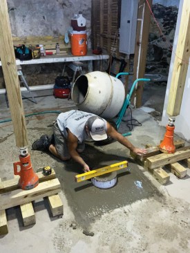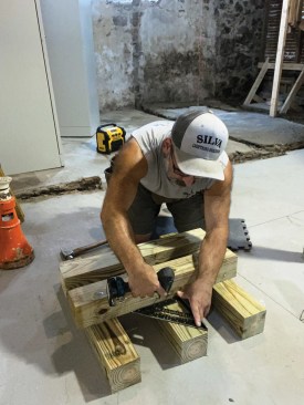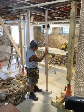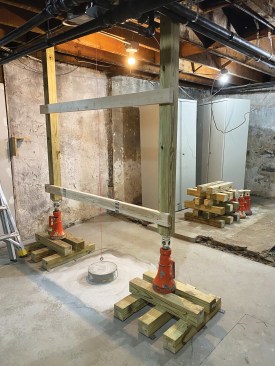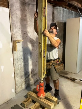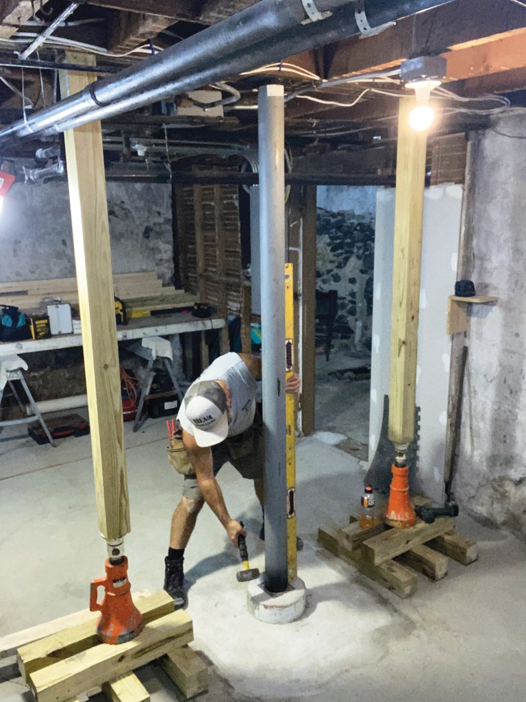 I started by assembling cribbing from 8-foot-long 4×4 pressure-treated posts cut into 2-foot sections. Solid support is needed for the 20-ton screw jacks that I use to lift floor framing enough to remove a support post, and because basement slab floors are rarely level or smooth, I always shim the assembled cribbing carefully. Then, while jacking up the temporary 4×4 supports, I check them frequently for plumb in both directions. The cribbing at each location would be in place for about a week, during which time a lot of weight would bear on the assembly. With plumbing, waste lines, and gas supplies at stake, a major shift in the position of the building could be catastrophic, so I worked slowly and carefully to make sure everything was solid, flat, level, and plumb as I proceeded.