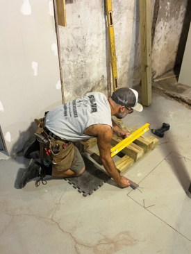 The author sets a laser level on a shelf mounted to the basement wall to mark reference lines on the temporary support posts, which can be periodically checked to make sure that they haven't shifted while working on the column.