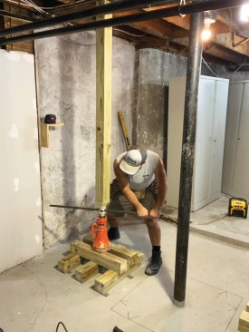 The author adjusts the support post until it is perfectly plumb in both directions, then turns the screw jack slowly to raise the floor framing just enough to take pressure off the existing column (no more than 1/4 inch).