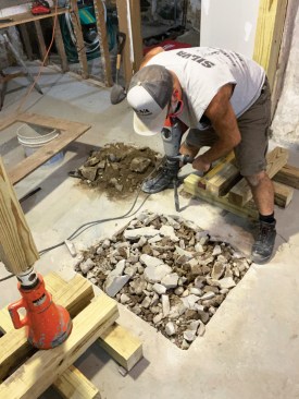 Because the bases of the existing columns were buried under the basement slab, the author had to chip away the concrete with a rotary hammer prior to removal of a column.