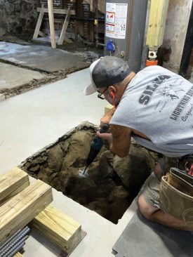 After breaking away enough of the slab with a rotary hammer to remove the old column, I enlarged the opening in the slab to 30 inches square. Then the hard part began: removing enough of the underlying soil and broken ledge to provide solid bearing for a new concrete footing. In some cases, the rocks were large enough and extended far enough underneath the slab that attempting to remove them would have caused the edge of the slab to collapse. So, for each of the nine new footings that were needed to replace the four original ones, I had to make a careful judgment about what material could be removed and what could remain.