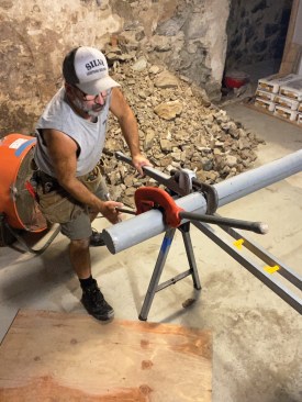 To make cutting the Lally column to length easier, the author holds it in place with a large aluminum pipe wrench to keep it from spinning while turning the cutter.