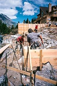 When a couple from Fallbrook, Calif., approached me last year and asked if I would design and build their Eastern Sierra vacation home, I remember thinking I was in for a hard start. Their 10,000-square-foot lot consisted largely of a terraced granite cliff, with grades as steep as 50 degrees. Getting a house to stay put on that rock hillside was going to be a challenge. On flatter lots, rock outcroppings are often blasted away to accommodate the floor elevations. Since this lot dropped away from the road access, the floor levels finished above the outcroppings, and we were able to form to undisturbed ledge. The method used to fasten a foundation to ledge depends on the type of rock and its shear strength, and it’s important to bring in an engineer early in such a project. We were fortunate that the ledge material we were working with was hard, stable granite, which allowed us to pin directly to the rock without having to blast away any loose or shattered material. Rough Start From the beginning, forming to the ledge presented challenges; even the first step of staking the corners required a rotary hammer. To erect batter boards, we drilled 3-inch-deep holes in the ledge, inserted 4-foot-long steel form stakes, and attached horizontal 1×4 wooden form stakes with drywall screws, screwing through the predrilled holes in the steel stakes (see Figure 1).