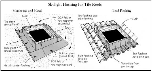When we install a skylight, we start by framing in a 2×6 or 2×8 curb. The sides and ends of this curb get covered with the felt or the hot-mop tar. The felt or hot-mop then gets covered by formed metal flashing. The top, side, and bottom pieces of this flashing are shown in the illustration. Notice that water rolling down the sides and off the bottom of the metal flashing runs over the membrane and under the tile.