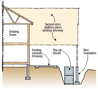 It is important to take steps to minimize undermining soon after excavating for the new footing. Provided there are no space limitations, rip-rap blocks — large one- or two-ton concrete blocks — can be used to contain the material under the concrete driveway. A more expensive option would be to pour a retaining kneewall, separate from the new foundation, against the exposed soils. This requires building a one-sided form.