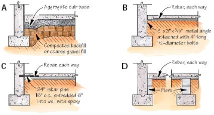 A.Brent Anderson responds: There are many ways to support a garage slab next to a basement wall. The best approach is to provide compacted backfill to 95% Proctor density from the footing to the sub-base (see “Soil Compaction Basics,” 3/94). The sub-base should consist of 4 to 6 inches of coarse aggregate (illustration A below).