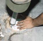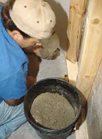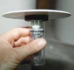 Figure 1. A special check valve is used to prevent the sub-slab ventilation system from sucking indoor air through the floor drain. It opens for drainage when weighted down by accumulated water, but when the drain is dry, a spring-loaded ball provides a seal that maintains negative pressure beneath the slab (top). Once the valve has been cemented in place (center), any visible cracks in the slab or foundation walls are repaired with a durable sealant (bottom).
