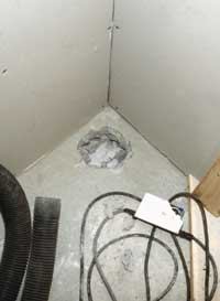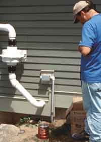 Our first step was to cement a special check valve into the floor drain and seal visible cracks in the floor slab (see Figure 1). Although that won’t solve the radon problem in itself, it’s necessary to prevent the vent pipe embedded in the slab from sucking air through such openings, effectively short-circuiting the whole system.