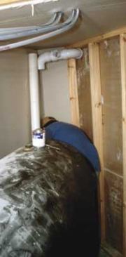 Figure 3. A length of 3-inch PVC — the lower end of which will be cemented into the slab — turns to pass through a partition wall (top). The sanitary tee will accept a second vent pipe leading to the garage. Above, the main vent line continues through a finished portion of the basement (later enclosed in a pipe chase) before exiting through an opening in the band joist. Like plumbing vent pipe, radon venting must be pitched enough to allow condensate and rainwater to drain.