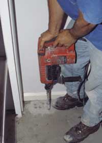 Figure 4. A second hole was hammered into the garage slab to create an additional vent sump (top). The vertical pipe was cemented in place with its open end extending just beneath the underside of the slab, minimizing the risk of blockage by an unexpectedly high water table (above). The uncemented cap on the vent line allows for later expansion, if needed.