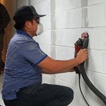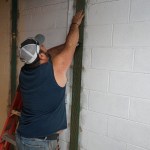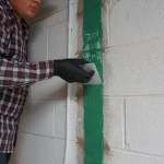After setting up the site with temporary lighting, painter’s plastic, an air scrubber, and drop cloths, we laid out the project. On this specific job, the engineer specified strapping “not to exceed 4′ 0″ on center.” We laid out the strap locations on the wall and began to prep the wall by removing the paint with a grinder so we had a clean surface. (If there’s no paint present, we usually still go over the strap locations with a surface grinder to ensure a good epoxy bond.) We also pointed the mortar joints and any horizontal cracks so we had a flat surface at each strap location.