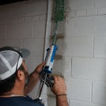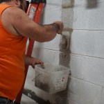 Toby applies epoxy to the wall in a close pattern.
