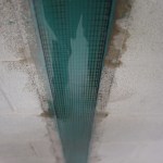 With the wall fully prepped, we were ready to lay down a bed of epoxy, spreading it out to ensure complete coverage. We then applied the strapping, pressing it firmly into the epoxy. The goal is to have the strapping fully saturated and encased within the epoxy. To achieve this, we needed to add epoxy to the outer face of the strap and smooth it out with a plastic applicator. The manufacturer of the reinforcing strap used here requires covering it with a thin sheet of plastic and pressing out any air bubbles that are trapped within the assembly. The thin sheet of plastic must stay on until the epoxy fully cures. We left it on, but it can be removed after the epoxy cures if you wish to paint over the repair.