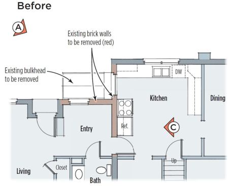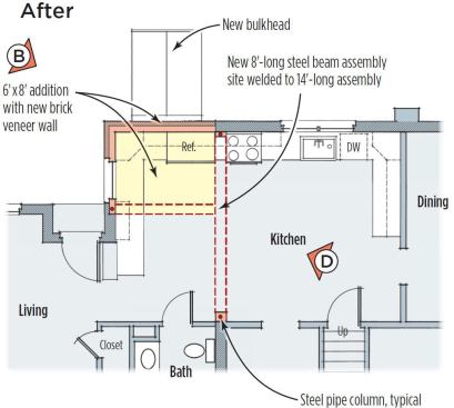 The owners of a 1920s brick home called my company hoping to expand and modernize their awkward L-shaped kitchen. They wanted to build an 8-foot-by-6-foot one-story addition on an inside corner in back of the house, break through the walls, and create a larger rectangular space for the kitchen. The biggest challenge was that we would need to remove sections of the exterior bearing walls and insert new support beams while holding up the second story.