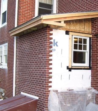 We had intended to re-use the old brick, but after trying to chip the mortar off we abandoned that idea. Fortunately, our bricklayer found a close match. The slight difference in color between the old and new brick would be most noticeable where the new addition met up with the original house. For a better blend, our bricklayer toothed the bricks together in that spot, and we also placed a downspout there. Where the addition meets the newer part of the house, the bricklayer used a simple vertical joint.