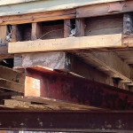 With the cribbing towers in place, holes were busted in the sides of the foundation to facilitate getting the steel in. There were two long steel beams that ran front to back and then a series of four beams that sat on top and ran side to side. We cut 2x4s to the length of the future window openings and screwed them into the mudsill. This allowed the house movers to see where the future openings would be and locate steel accordingly. Where the steel did not correspond to a window opening, the area would be patched with CMU.