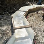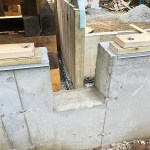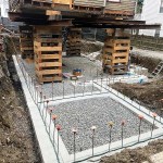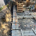 The foundation work was relatively straightforward. The only thing different was that once we had the footings placed, the site work contractor came back to place stone to the top of the footing. It was a lot easier to do this before the walls were formed and poured and a house stood over it. Beyond blocking out pockets for the steel, it was business as usual for the rest of the foundation work.