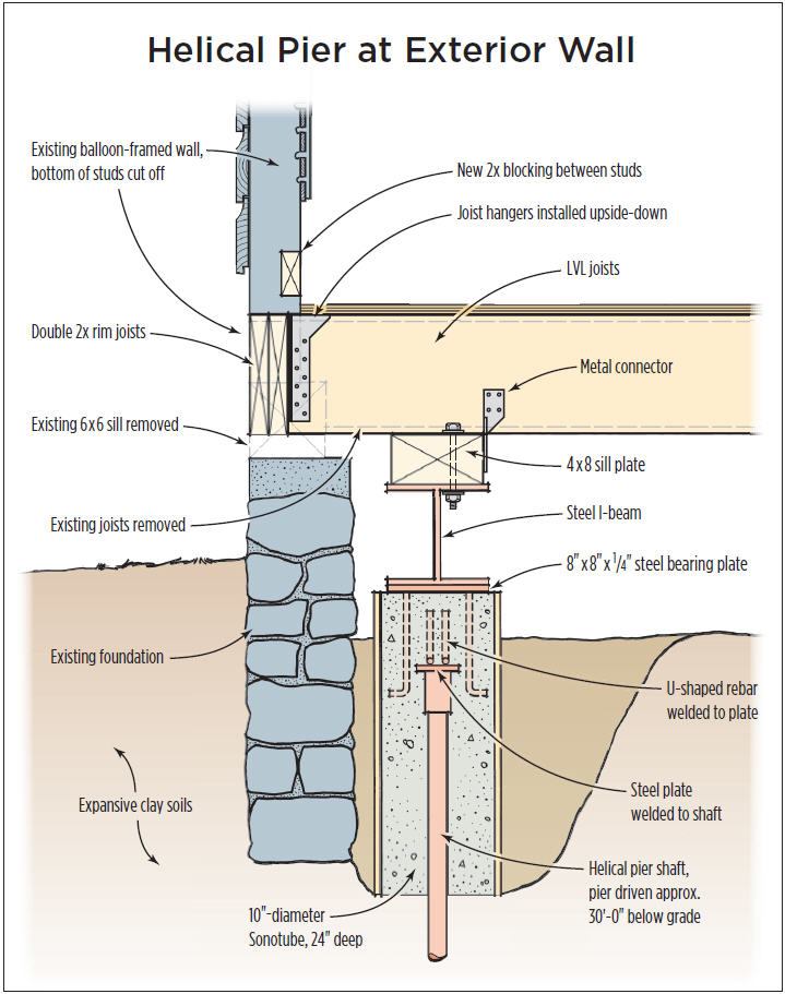 When one of those splinters lodged in their daughter’s foot, my clients decided it was time to contact an engineer, who proposed replacing the entire ground-level floor system with a new one supported by helical piers (see illustration). The piers and new LVL floor framing would also support the wall framing and roof loads; the old concrete foundation would remain in place, but it would no longer serve any structural purpose. I was hired because I was the only builder bidding the job who suggested that this would also be a good time to improve the home’s energy performance by air-sealing and insulating the new framing.