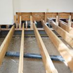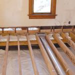 LVL joists. Next, we removed enough plaster and lath from the bases of the bearing walls to expose about 18 inches of framing. We then carefully extended the studs down to the girders, a stud at a time, pulling the temporary supports as we went and sliding the new LVL joists into position, 12-inches on-center. We used metal shims to bring each joist up to our benchmark elevation, then toenailed them to the plates. Later, we reinforced the connections with metal connectors. Finally, we fastened doubled pressure-treated 2-by rims to the floor joists, reinforcing the connection with upside-down joist hangers, per the engineer’s instructions.