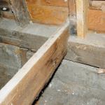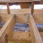 Before we could remove the old sills and start reframing the floor, we had to support the exterior walls. To do this, we bolted LVL ledgers around the perimeter of the building using structurally rated hex-head screws, two screws to a stud (see slideshow). We then laid doubled 2-by plates on the ground and cut 4×4 posts to fit snugly between the plates and the ledgers on 12-inch centers. With the building thus supported, we removed the old sills a section at a time and began cutting off the bottoms of the studs to a level line that we had marked with a laser.