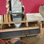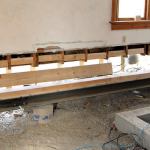 Steel girders. We installed three steel girders, capped with wood plates, to support the new floor framing. The I-beams were fabricated in sections designed to be bolted together, since getting a full-length beam would have been impossible, given the constraints of the site. Even so, this was one of the most difficult parts of the job. Sliding the steel underneath the center bearing wall was particularly tricky, because we had to do so without disturbing the temporary supports under those short joist remnants. After the steel beams were in place, we had them welded to the cap plates on the helical piers.