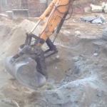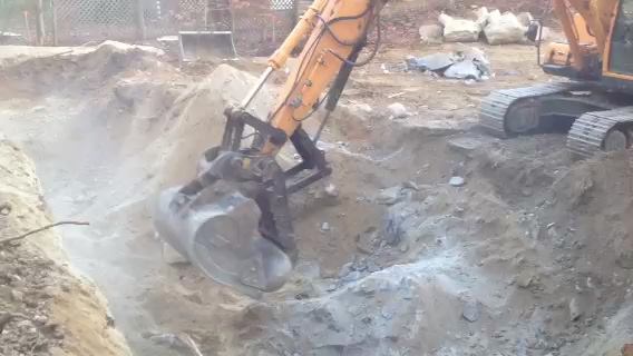 The boulder seen in the last slide cannot be moved or dug out. Blasting and drilling cannot be used in the densely developed neighborhood, so the excavation contractor breaks up the rock by continuously dropping a one-ton steel weight nicknamed "The Headache Ball" from the bucket of his excavator.
