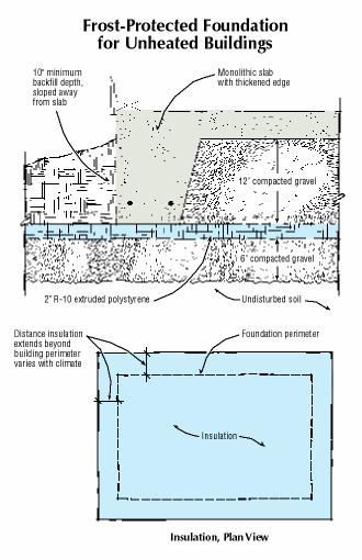 By combining rigid foam insulation with a well-compacted, free-draining substrate, a frost-protected shallow foundation prevents heaving damage, even in an unheated building in the coldest climates.
