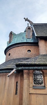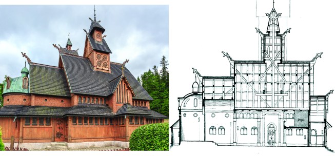 Opposite an ice-cream stand and a pizza shop, on a steep granite-cobbled street that leads into the forests cloaking the Karkonosze mountains that form the Polish-Czech border in Silesia stands an unusual wooden church. I was instantly drawn to the “stave” (Norwegian word for “post”) structure. Except for a few copper flashings and gutters, a small domed copper roof jutting off one end, and elaborately forged wrought-iron door hinges, the church—which rises 50 feet to the top of its central tower and 35 feet to the ridge of its imposing 16:12-pitch main roof—is entirely wood. As in, no metal fasteners whatsoever. All those wall shingles (which I heard others comparing to dragon scales and the surface of pine cones, both of which were probably intended) and the cascades of wood roof shingles are doweled in place.