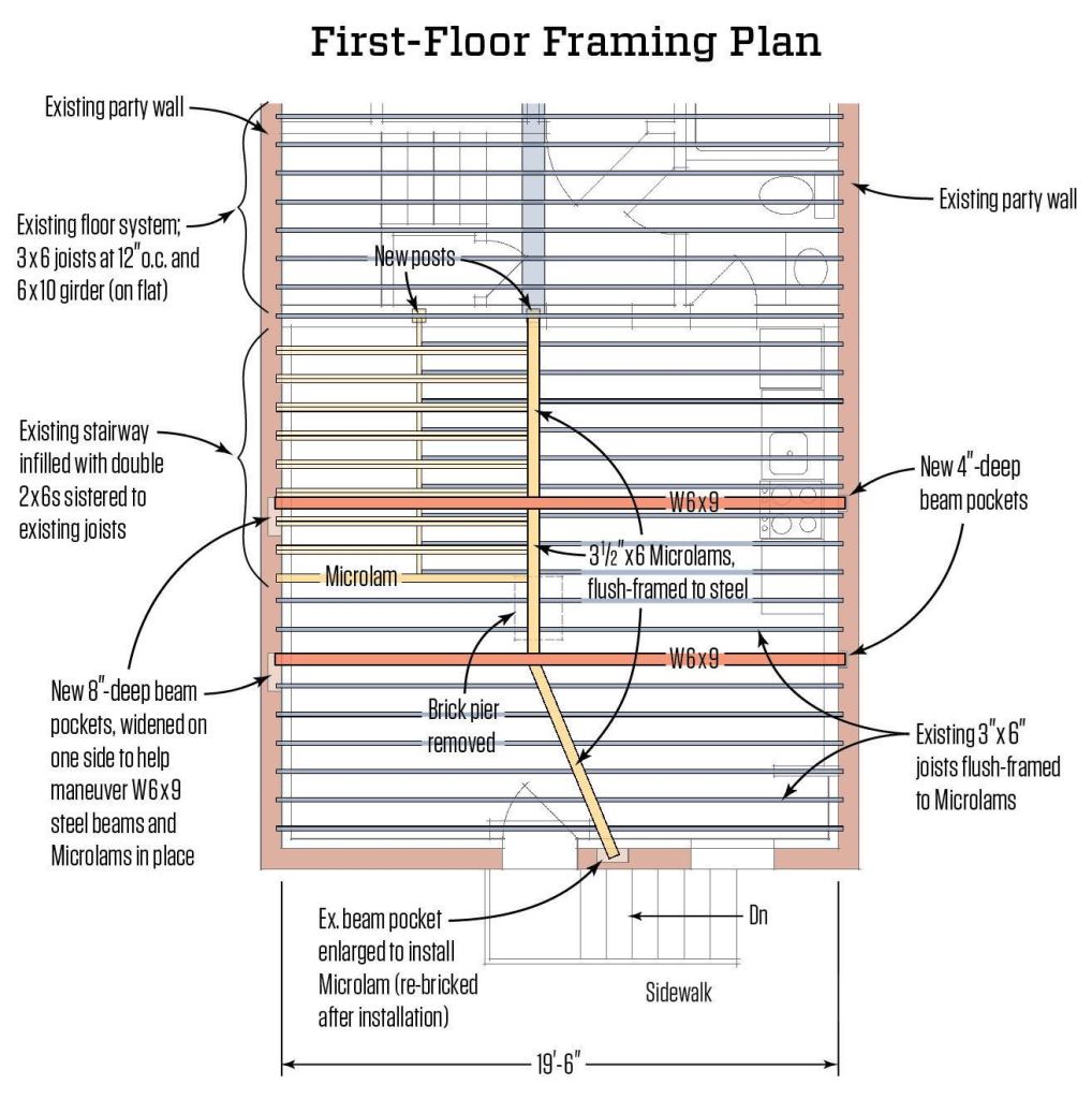 During design, the clients were concerned that the apartment’s 375 square feet would feel small. The basement’s low 7 1/2-foot ceiling and a dropped box beam supporting the first-floor joists impinged on the space. And an existing brick pier supporting the dropped beam landed smack in the middle of the apartment’s main room. The solution: Eliminate both the dropped beam and brick pier to maximize the perceived volume of space. Working with the architect, we came up with a plan to flush-frame the existing first-floor girders. We’d clear-span the width of the building with a couple of steel beams running parallel to the existing floor joists. This steel would support new Microlam headers in the floor to support the floor framing (see “First Floor Framing Plan”). It seemed a simple enough plan, but I knew better. A Hoboken brownstone is like a box of Cracker Jacks: There’s always a surprise inside.