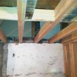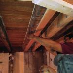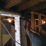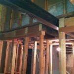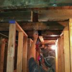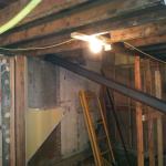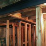 We shored up the existing floor system with temporary 2×4 stud walls, placing them around the steel, then started removing the dropped beam and the brick pier. We lifted the W6x9s in place, pushing them into the 8-inch-deep pocket and at a slight angle along the horizontal plane at the wider, chipped-away side of the pocket. We then moved on to installing the Microlam beams.