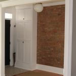 Finishing up. With the structural work complete on the first floor, we moved on to the other floors, juggling the clients (who stayed in the house during construction) from space to space. The finished basement, though small, looked pretty slick. The dedicated entry on the first floor featured a powder room, closet, and new 6-foot opening to the living room. We cleaned and sealed the existing brick party wall and installed a built-in closet to hide the electrical panel by the new front door.