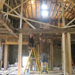 As we demolished the interior finishes and exposed the existing framing, we found that in some places the outside walls had spread so much that the floor joist tenons had slipped out of their mortises. In the second-floor framing, we discovered a 44-foot-long 8×12 oak beam spanning the building from front to back. As part of the last renovation, the ceiling in this area had been furred down flat with metal framing and drywalled, so the engineer didn’t know about the beam — which had a 6-inch sag in the center.