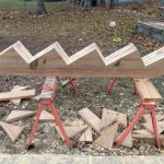 To improve accuracy, I moved to stepping off the stringer with trammel points. I set up my trammel points on a board the length of the hypotenuse of the stair’s rise and run, and at first used this trammel set to step off the distance along the edge of the board.