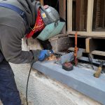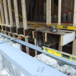 We got lucky! The engineer largely agreed with our solution. This was not a foundation failure; only the first two courses of stone had become unstable. The rest, which extended another 8 feet down looked stable. The engineer agreed that if we could grab hold, so to speak, of those top courses of stone, clamp them together and effectively bind them in steel, grout and pin them to the foundation below, we would have a solid structure to which we could reattach the floor framing. On this, we could rebuild the rim and provide solid bearing for the wall. Once we agreed on the proposed this cost effective approach, the engineer specified the exact details for an angle-iron ladder, welded up with angled cross-braces that also functioned as brackets for securing the new rim and joist connections. The ladder spanned the top of the foundation, and included L-brackets to which we attached a new rim beam. Before installing the steel, we had to first clean-up the loose foundation courses—very much like drilling out tooth cavities and removing the loose debris—and then pour reinforced fillings—rebar embedded in non-shrink grout. We were relieved that the engineer agreed that grouted rod would suffice to pin the steel to the rock. Drilling into an old foundation to set epoxy anchors can be very disruptive and we didn’t want our work to cause even more damage.