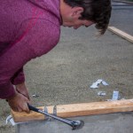 He then pulls the board back to his chalk line, measures the distance, and drills the holes.