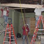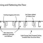 To reinforce the existing floor, plans called for contractor Jos… To reinforce the existing floor, plans called for contractor Jose Maldonado to install light-gauge steel C-joists centered between the existing joists. Leveling the floor was up to Maldonado (engineer Kathy Dunne says the sagging floor was still safe and strong). Maldonado chose to nail 2×6 sisters into the old sagging 3×8 members to create a new top edge that is level with the new factory-straight steel. When the floor is complete, a new light-gauge steel drop ceiling will be installed to create a flat, level ceiling for the room below.