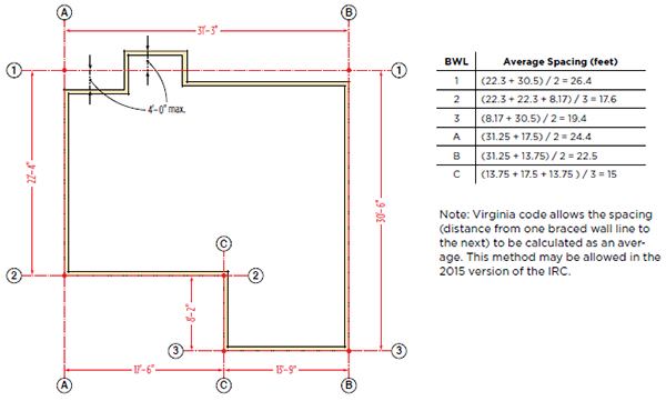 A prime example is that the old code required a 4-foot braced panel at every corner and one every 25 feet on-center, and if you wanted a window at the corner, you had to hire an engineer. In the 2009 and later code versions, however, the requirement for a 4-foot solid wall section at every corner is gone. Now, the nearest bracing panel can fall as far as 10 feet away from the corner (see “Locating Braced Wall Panels,” page 36).