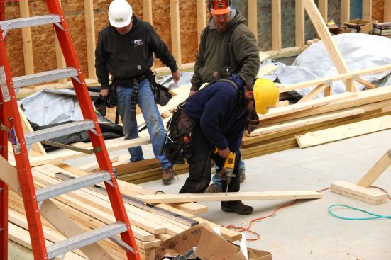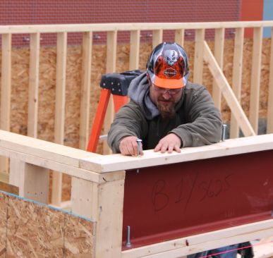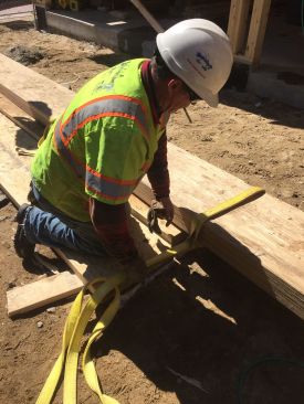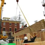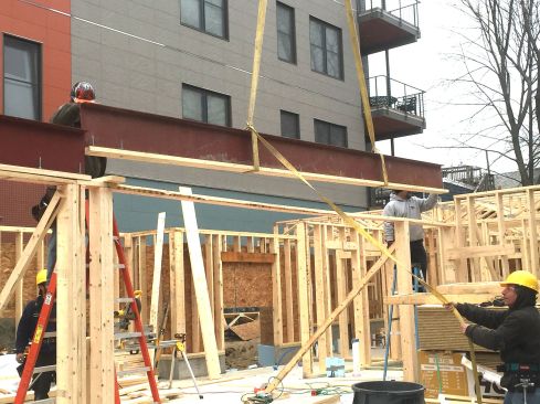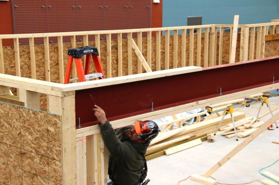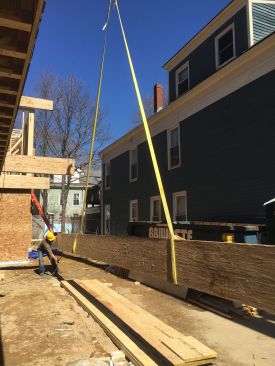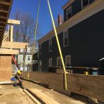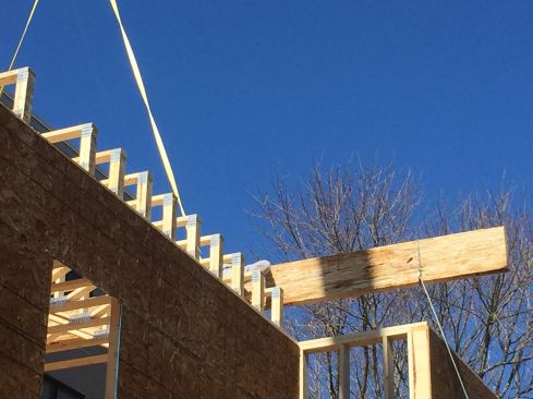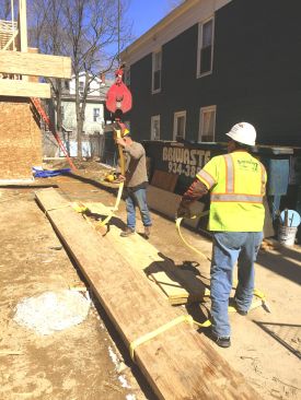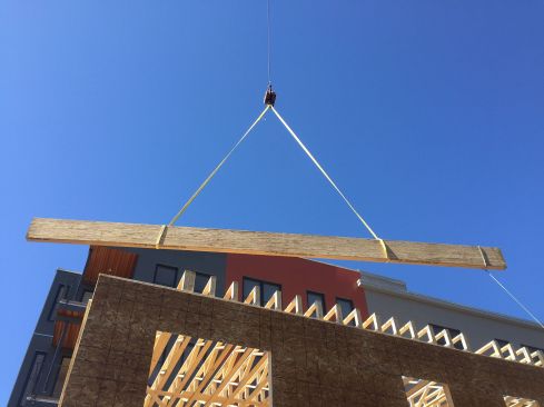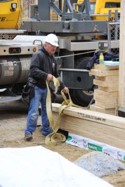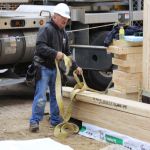 With the steel headers in place, the next task was to set the first level of Parallams—again, a job for the crane, along with plenty of skilled hands. On the upper levels, the crane was even more useful, as it came in handy for booming bundles of floor trusses and clips of sheathing up onto the higher stories.