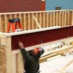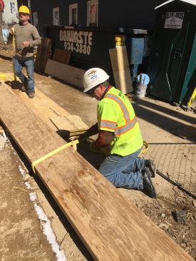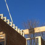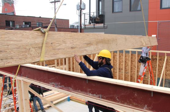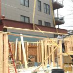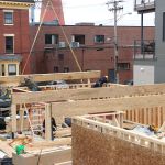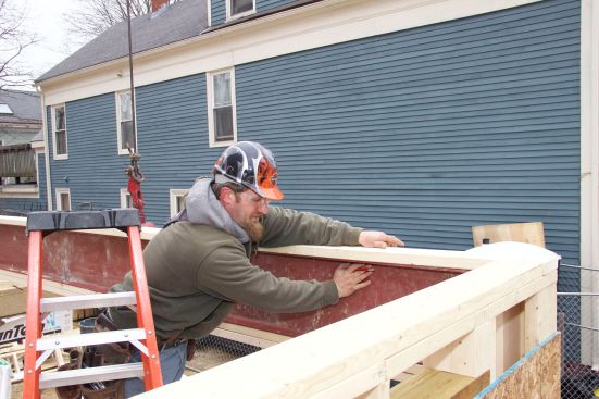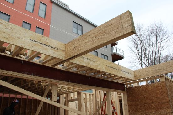 Detailing the two stories of balconies will be interesting for contractor Shawn Geyer, of Geyer Construction, who is responsible for all the building’s exterior details as well as the framing. The projecting PSL beams will have to be cut down with a taper to shed rain and equipped with outer beams and an infilled floor frame (also tapered for drainage). Then the deck structure will have to be waterproofed, tapered sleepers will be applied to restore a level plane, and finally, the decking and a railing system will be installed. The underside of the balconies will receive a tongue-and-groove board ceiling.
