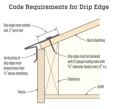 Section R905.2.8.5, Drip Edge, in the IRC spells out what the IRC requires: “A drip edge shall be provided at eaves and rake edges of shingle roofs. Adjacent segments of drip edge shall be overlapped not less than 2 inches. Drip edges shall extend not less than 1/4 inch below the roof sheathing and extend up back onto the roof deck not less than 2 inches. Drip edges shall be mechanically fastened to the roof deck at not more than 12 inches on center with fasteners (1, 2) as specified in Section R905.2.5 [roofing nails with minimum 12-gauge shank and 3/8-inch-diameter head]. Underlayment shall be installed over the drip edge along the eaves and under the drip edge along the rakes.”