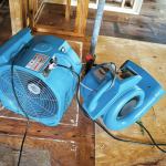 I own several conch-shell carpet fans — the type remediation contractors use to dry wet carpeting — as well as box-type air movers. I position a 50-50 mix of both types around the house based on moisture-meter readings. I chain and padlock the fans to the framing and run them 24/7 till the drying is done.