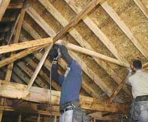 At this point, the upper rim goes all the way around the opening and is supported at the proper height. Next we install the commons 24 inches on-center between the king commons.