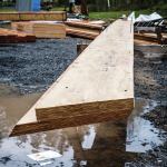 One key to speeding up the job is to pre-install as many of the pieces as possible on the ground so less time is spent fumbling up top. This applies especially to web stiffeners, which we like to nail to the I-joists before we begin setting rafters. Plywood web stiffeners, ripped to fit between the top and bottom flanges, are always needed at the eaves to provide a flush surface for nailing eaves blocking. We may also need them at the ridge if we are using hangers, in which case it is best to also install all the hangers on the I-joists while the rafters are still on the ground. That way, as the framer at the ridge installs each rafter, he just has to nail the hanger to the ridge, greatly reducing the amount of time he needs to work off a ladder.