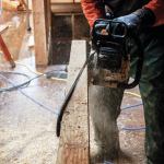 Plumb cuts on I-joists can be handled with a simple plywood jig. But making each plumb cut one at a time can be tedious on a whole house or large addition. Instead, for about the last eight years we have been using a Big Foot Head Cutter — a table attachment that goes on a chain saw — to gang-cut rafters.