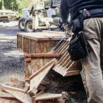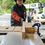 To cut squash blocks, we use the Big Foot saw again, chopping multiple pieces at one time. If the weather is decent (which isn’t always the case in the rain-drenched Northwest), we might use a miter saw for this. It only takes a few minutes to set up the stops, and then the cutting is foolproof.