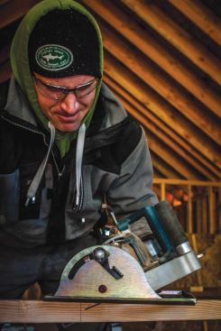 Cutting rafters. I can now cut eight hips (two per corner) and all the commons. To cut the hips, I use the Big Foot 10-inch saw with a swing table. This base plate will bevel to 75°, so it can handle the 67.5° bevels needed for the upper hip cheek cuts.