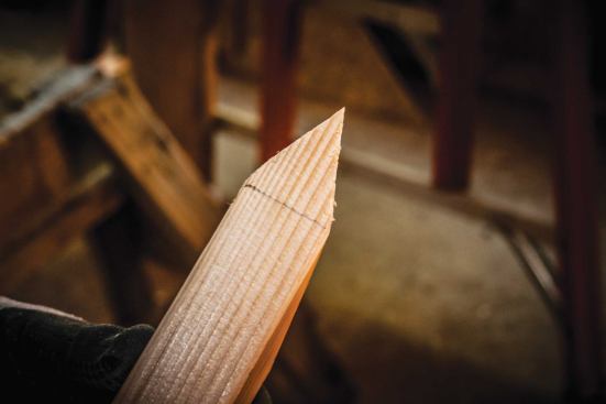 I like to cut the steep cheek cuts first, then pull the length and layout, and cut the lower cheek cuts. For the lower cuts, I square the length to the side of the rafter and draw a plumb line. Then I measure the setbacks (5/16 inch) on both sides of this first plumb line, giving me three parallel plumb lines. I cut on the “long” line first, with the blade angled back toward the rafter; then I cut the “short” line from the other direction, giving me the double cheek cut.