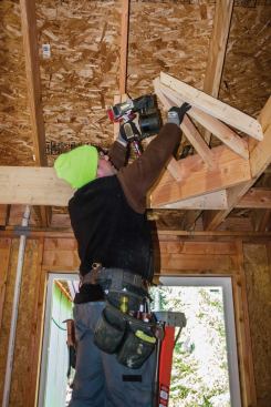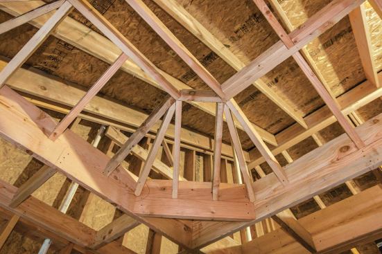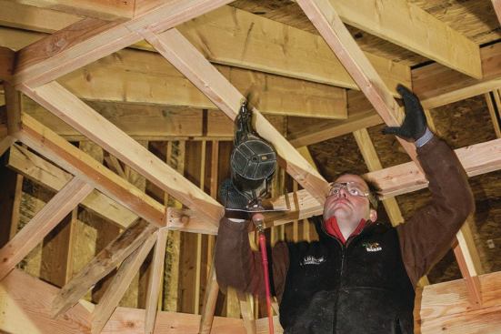 I like to frame all my corners (two commons and one hip), then fill in the common rafter framing. Once that is finished, I measure in the upper ceiling framing and nail it off, making sure it’s strong enough to hang from and that there will be no ceiling joists in the way of the light placement.