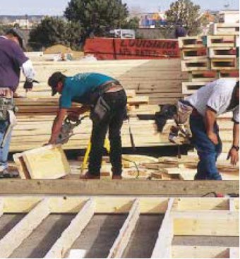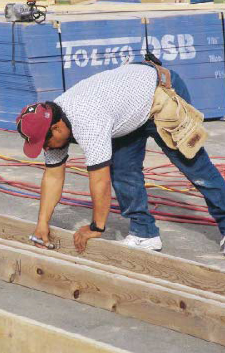 I. Be there before the lumber package is dropped to direct the driver or make sure you have marked clearly where the package is to be dropped. Give yourself enough room to break the package down without crowding yourself, get it close enough to the building that you don’t have to walk too far, but not so close that it’s in your way. The package will usually be stacked for the driver’s convenience, not yours. Most often, the plate material and the floor joists will be under the plywood. While you are snapping lines with one of your helpers, the other two workers should be breaking down the package and sorting it out.