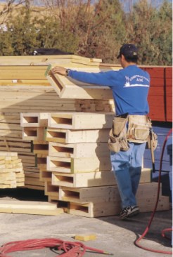 • Stack all materials on stickers 4 feet apart, off the ground. This helps keep the lumber in better shape, makes it easier to handle, and keeps the job site neater.